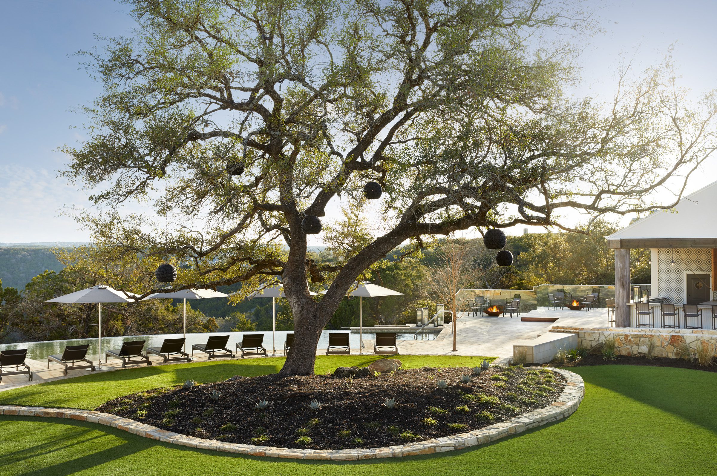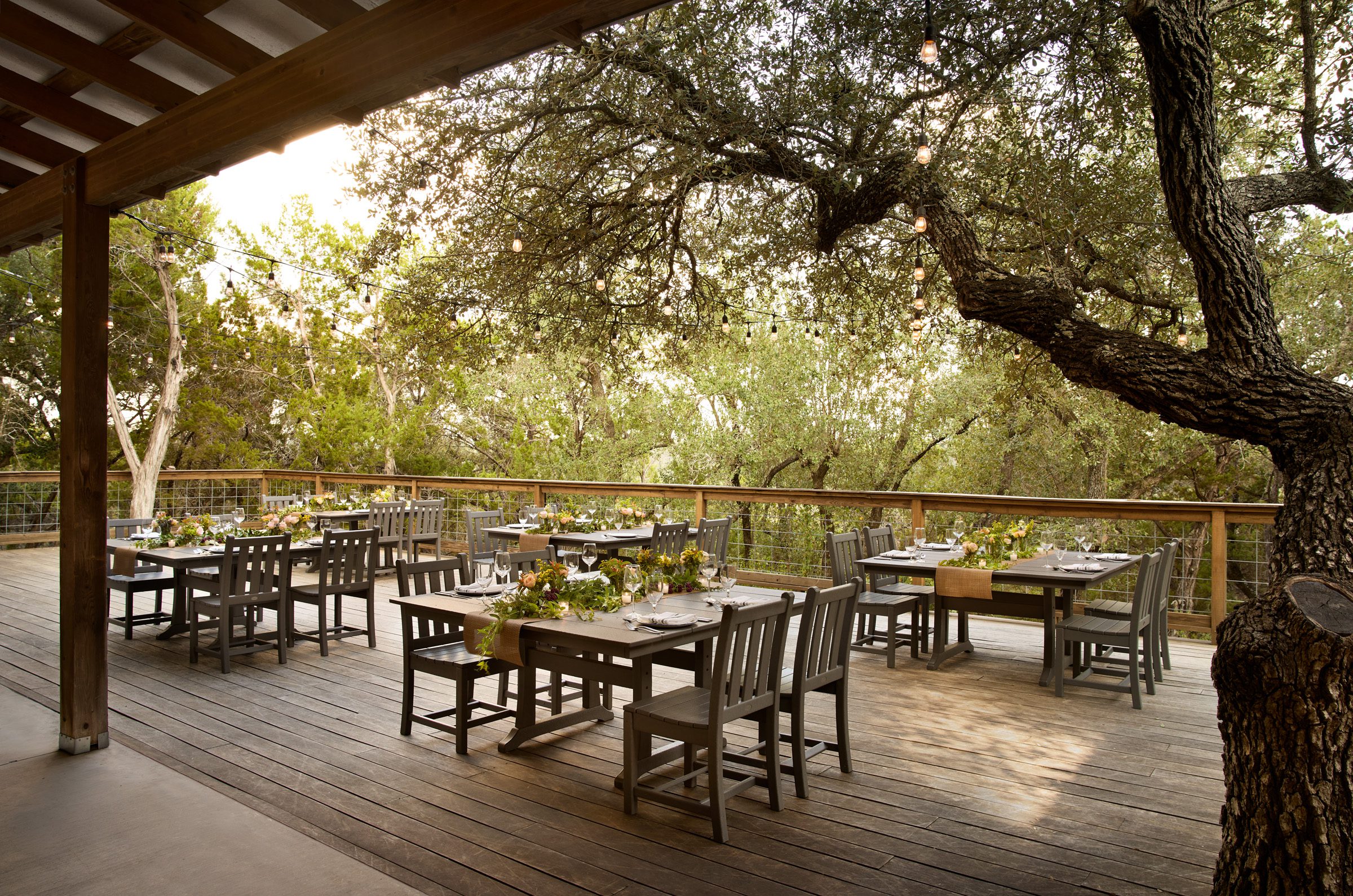 The Balcones Deck offers an inviting open-air setting, ideal for intimate dinners surrounded by the breathtaking beauty of the Balcones Canyonlands. Guests can savor every bite while being fully immersed in the serene sights and sounds of nature.
