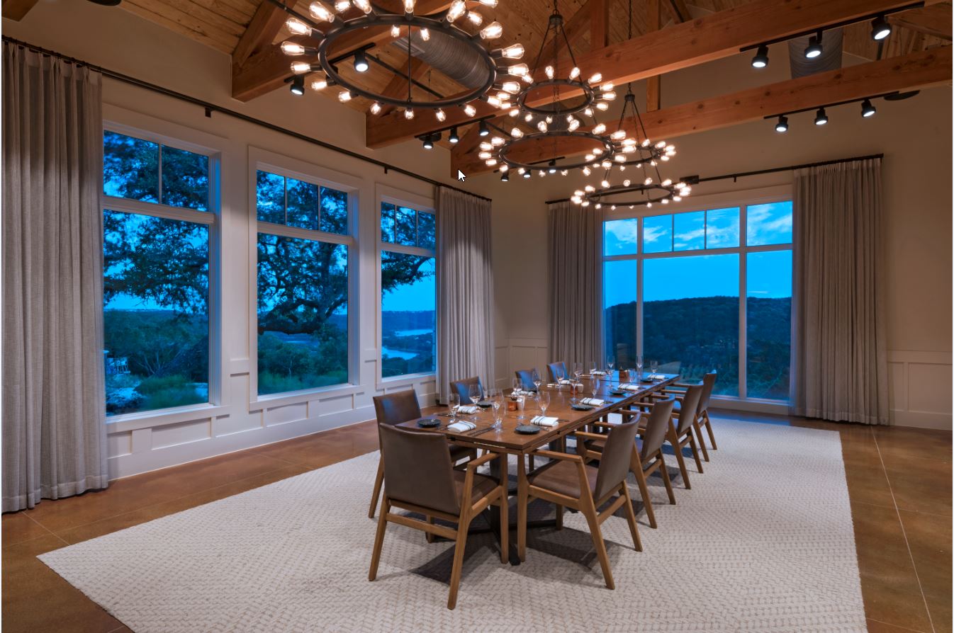 The atmosphere of The Nook private dining room in Hilltop Crossings Kitchen melds the refined and rustic for a warm and welcoming feel. The large windows overlook the Balcones Canyonlands Preserve and Lake Travis, offering spectacular views.