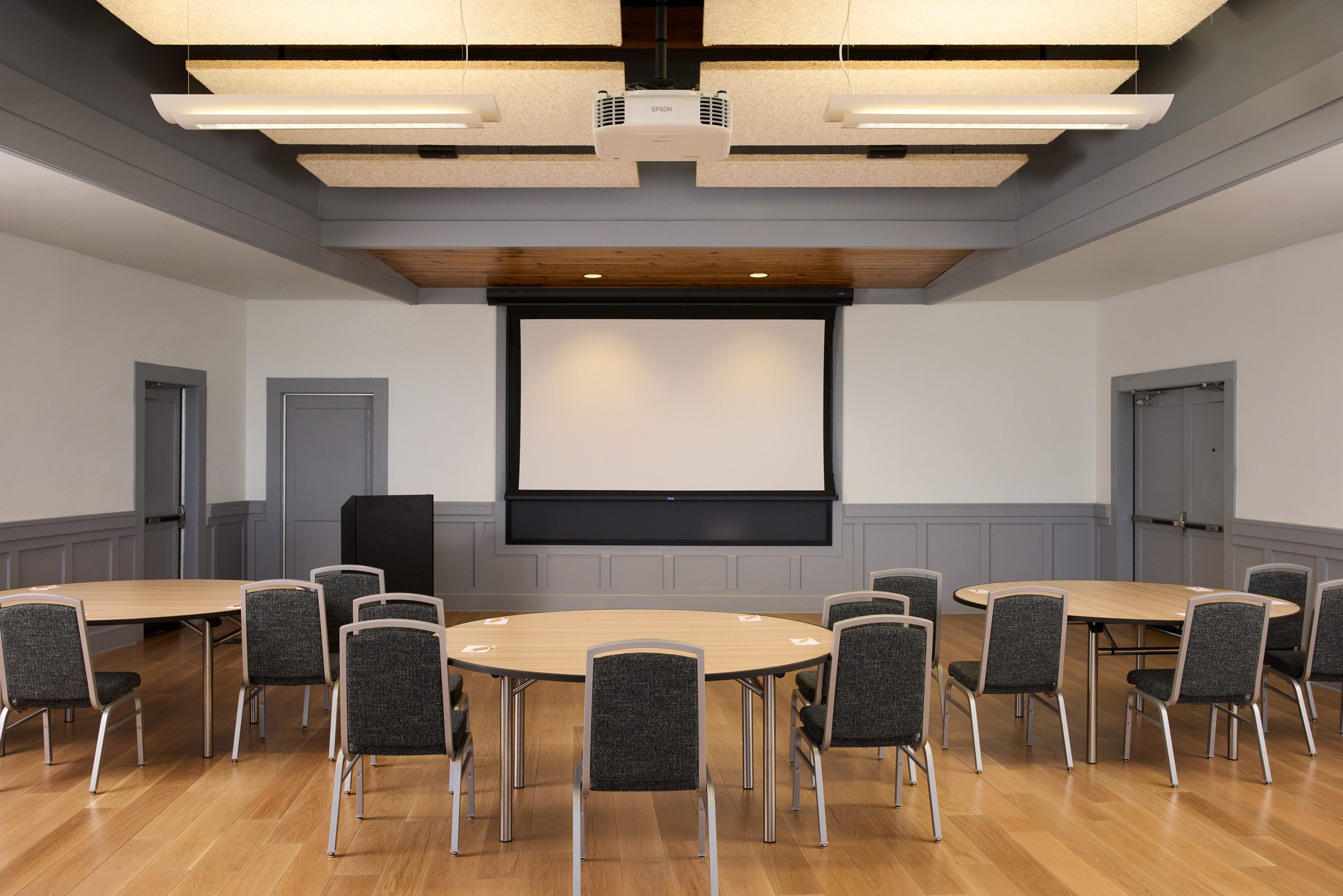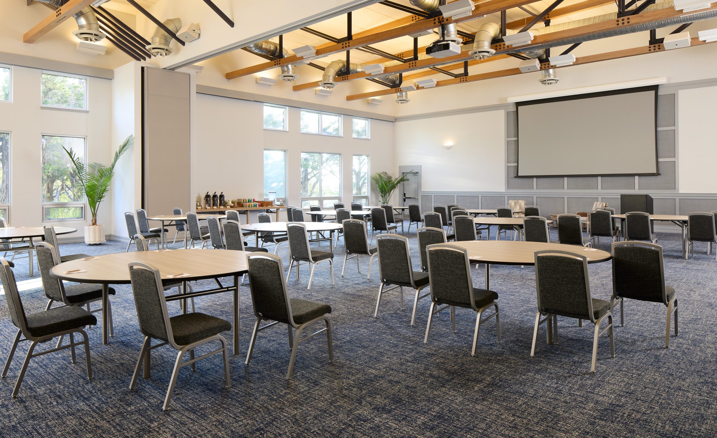 A TECTUM ceiling, exposed wood trusses, and a wall of floor-to-ceiling windows create a stunning backdrop for your gathering; features also include a ceiling-mounted projector and motorized screen.