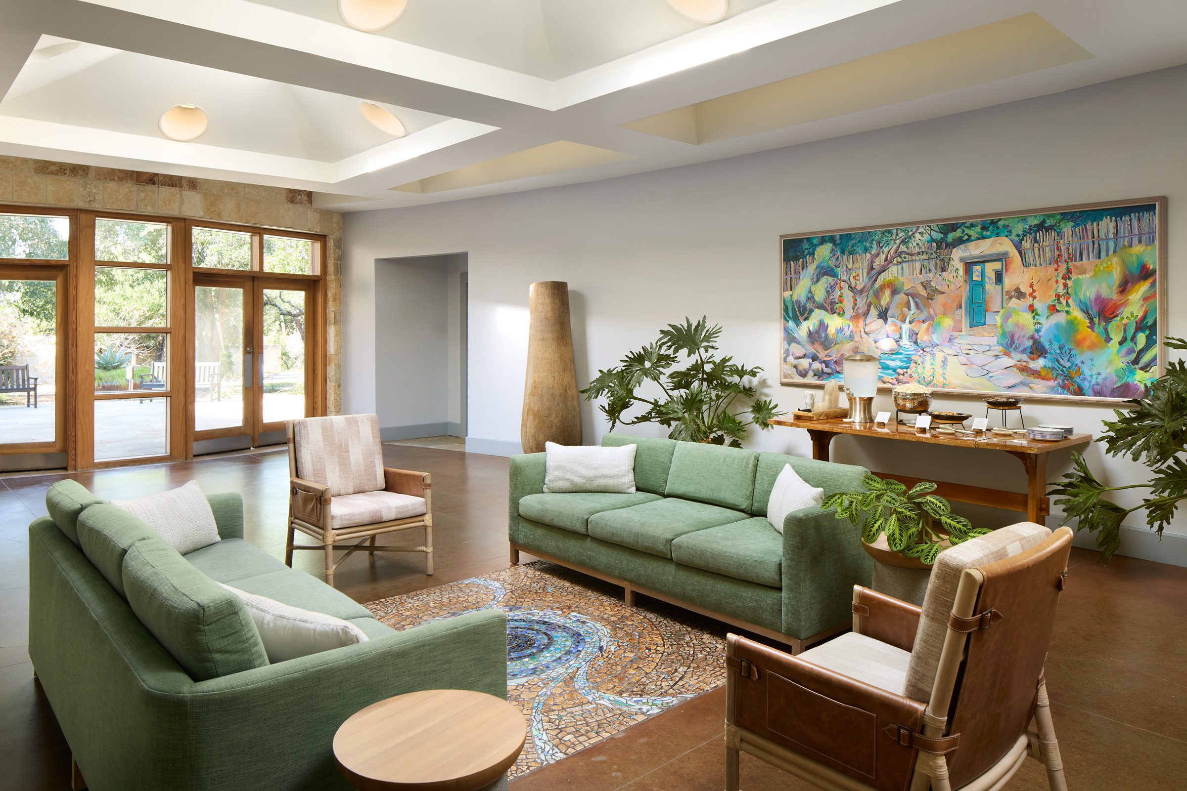 A bright, flexible gathering space ideal for coffee breaks, casual lunch setups, or giving group participants a comfortable area to step away and take calls between sessions.