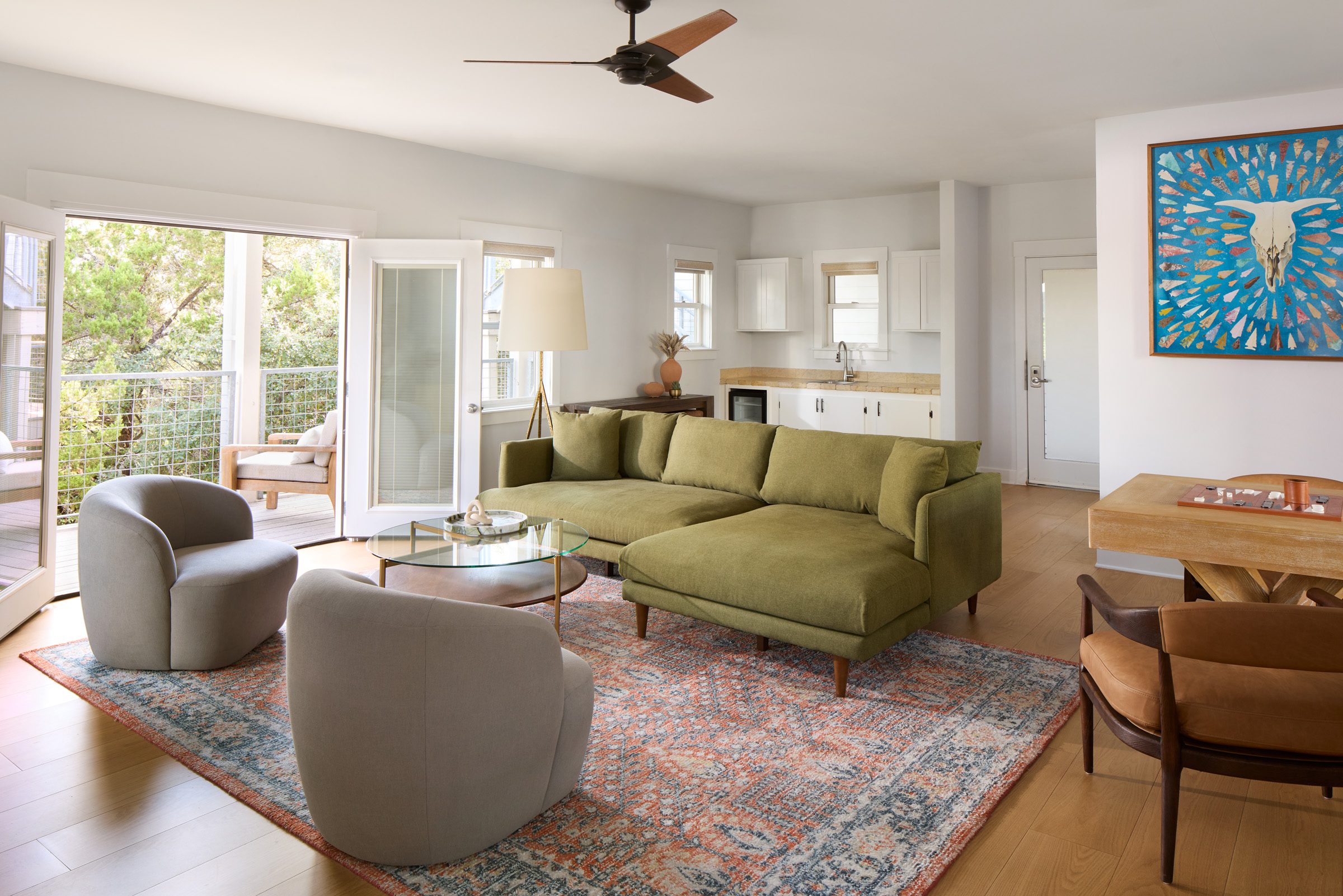 The Parlor suites are a cozy choice for an intimate meeting or event with comfortable couches, soft chairs, a wraparound porch, a kitchenette, and a private restroom.