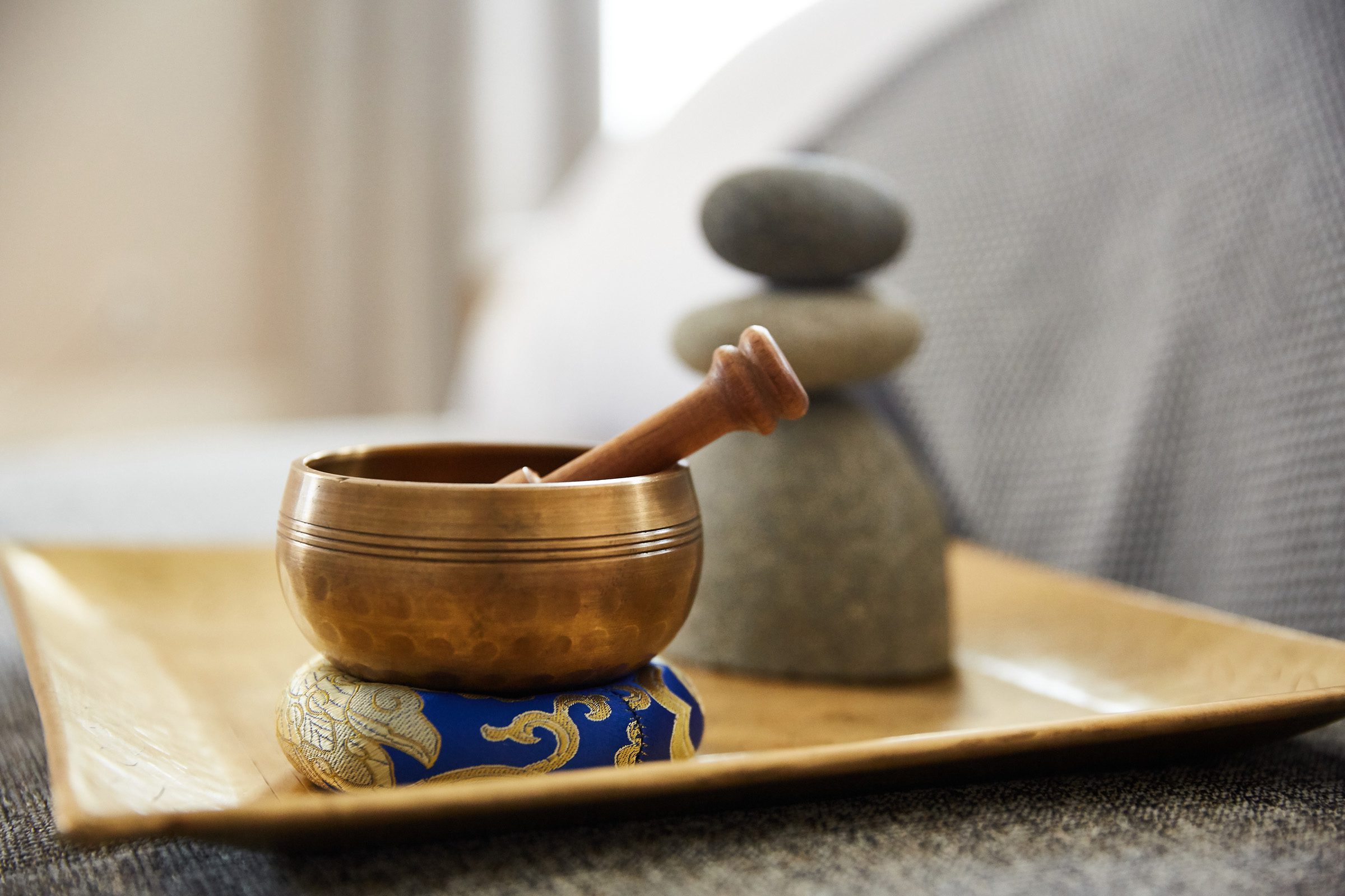 Tibetan singing bowl, stacking stones, & meditation pillow