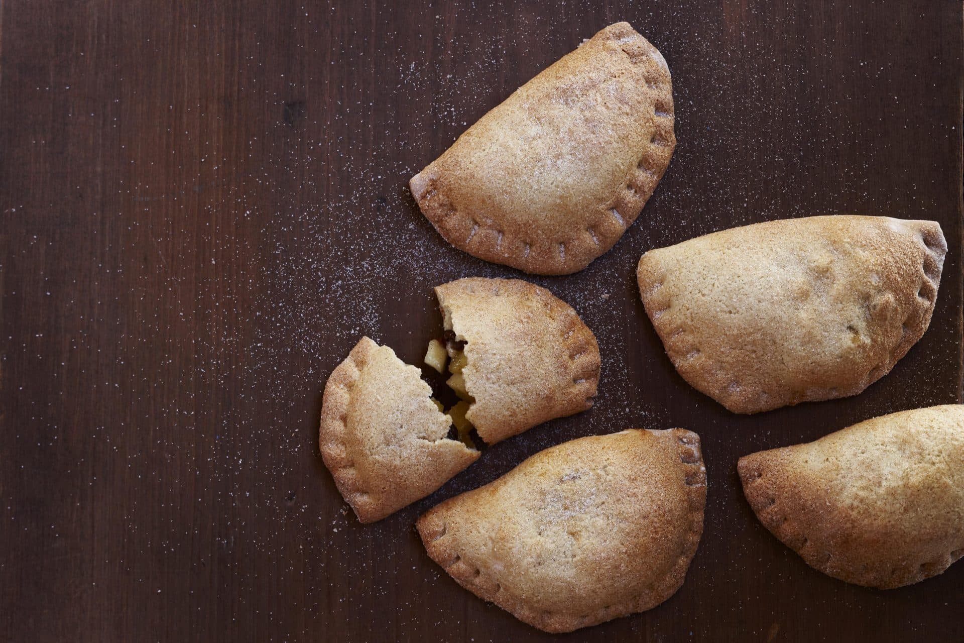 - Lightly flour a work surface and roll out the dough to 1⁄8 inch thickness. Cut out 3-inch circles and place 1 teaspoon of the filling onto the center of each circle. Fold the circles in half and seal edges with the tines of a fork. Place tortelli on a baking sheet lined with parchment and sprayed with a nonstick spray. Brush each tortelli with the lightly beaten egg and bake at 350°F for 15 to 20 minutes or until golden brown. Cool and dust with powdered sugar.