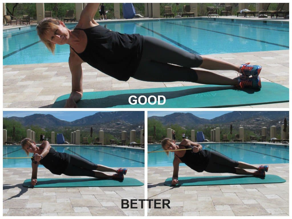 By simply taking the plank and widening the foot stance to about double shoulder width and grabbing a resistance band even the most hardened plank masters can be brought to submission in about 15-20 seconds. When a core exercise brings fatigue in a short period of time (15-20 seconds) you are actually getting stronger not just getting better at gym tricks.