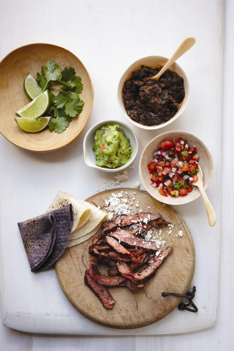 - To serve, lay 1 blue-corn and 1 yellow-corn tortilla on each plate and fill with the sirloin. Top with 2 tsp. each of the guacamole and salsa. Garnish each plate with a lime wedge and serve immediately.